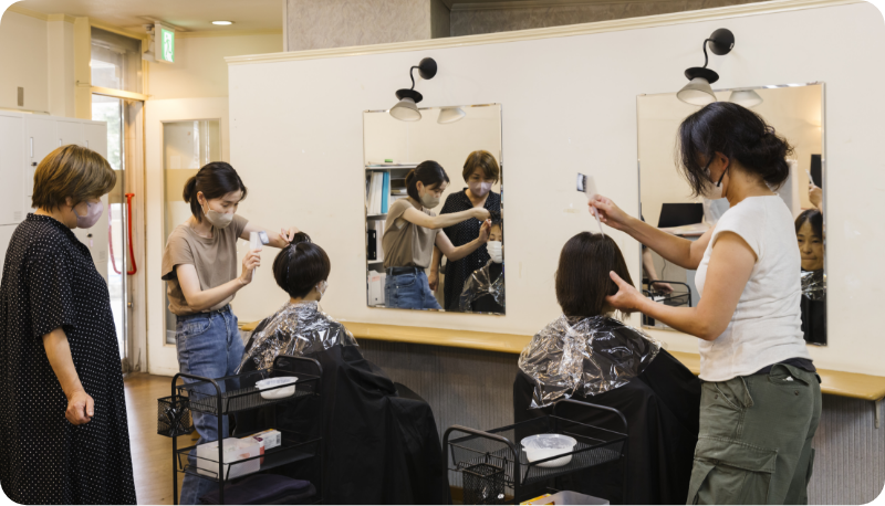 - ・ 座学では、髪や薬剤の知識、店舗での働き方・接客、ビジネスマナー、社内制度を学びます。