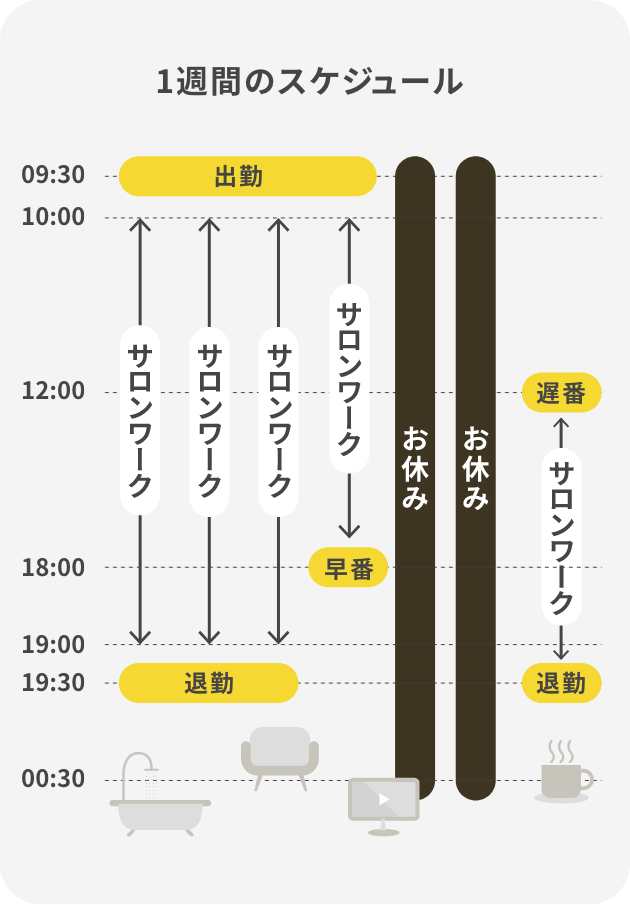- 1週間の勤務内訳:2日お休み、3日フル出勤、1日早番、1日遅番