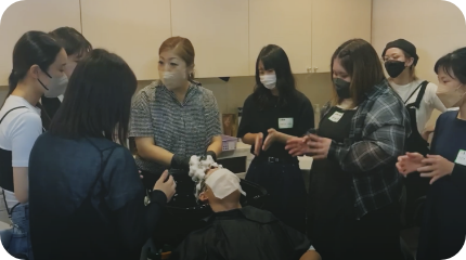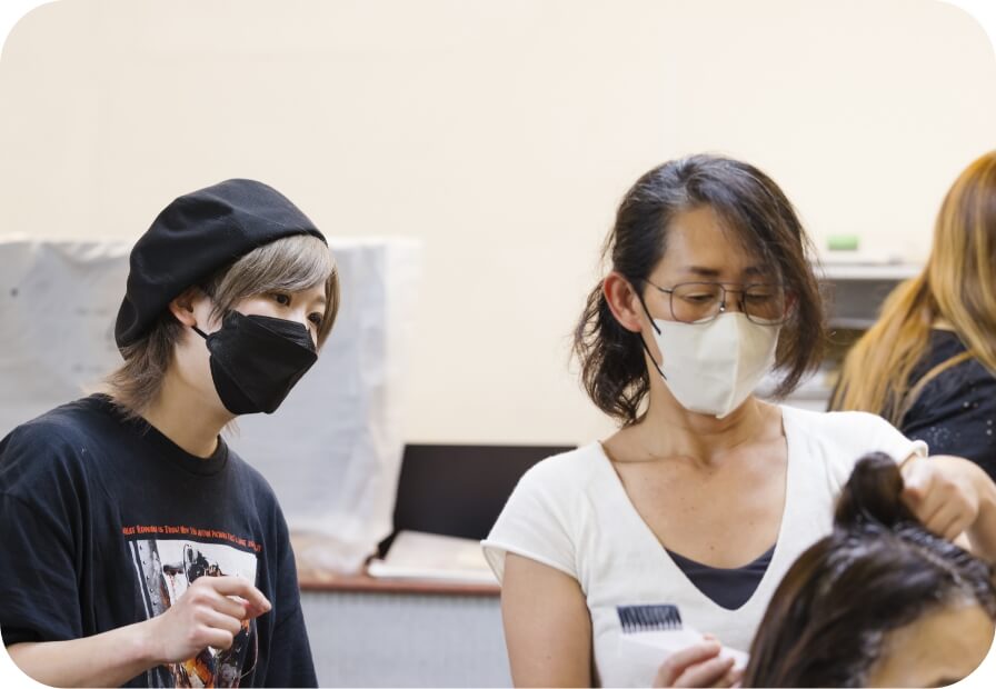 fufuに入社される方は、ブランクのある方も多くいらっしゃいます。安心して業務に入っていただけるよう、多様な研修制度を用意しております。また、キャリアの推移に合わせて、必要な研修を受けられるようになっています。お店や自宅での練習をサポートするために、ウイッグやクランプも会社が用意していますので、事前に何も購入する必要はありません。もちろん研修の費用もかかりませんので、ご安心ください。